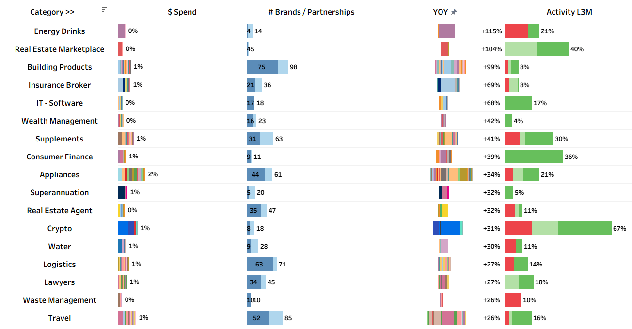 The largest new deals in the last quarter were top tier partnerships amongst national properties - specifically Cricket Australia’s new Shirt Front partner in Westpac, and Super Rugby’s new naming rights sponsor in Swyftx.