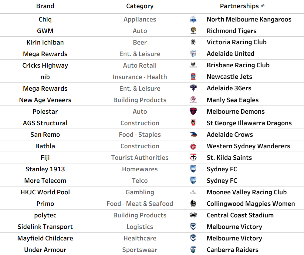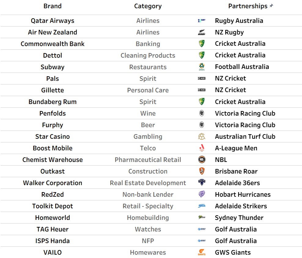 Others represent a change in partner (e.g. WestPac’s new partnership with Cricket Australia replaces CommBank).