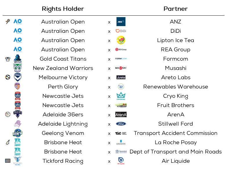 ANZ x Tennis Australia, Formcom x Titans, Renewables Warehouse x Glory & more